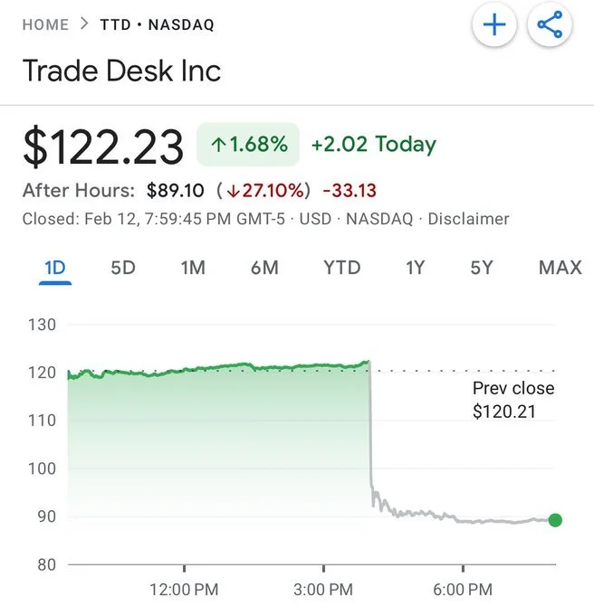 The Trade Desk (TTD) ha registrado una de sus mayores caídas en bolsa desde su salida a Nasdaq en 2016. Tras anunciar sus resultados del cuarto trimestre de 2024, la compañía sufrió un desplome del 27%, dejando sus acciones en 89,10 dólares, una fuerte caída desde los 122,23 dólares del cierre regular de mercado. Este revés llega después de un año récord en el que la compañía superó los 12.000 millones de dólares en inversión publicitaria gestionada y alcanzó ingresos de 2.400 millones de dólares, un crecimiento del 26% interanual. Sin embargo, por primera vez en 8 años y medio, The Trade Desk no logró cumplir con sus propias previsiones, reportando ingresos de 741 millones de dólares en el cuarto trimestre, cuando se esperaba al menos 756 millones.