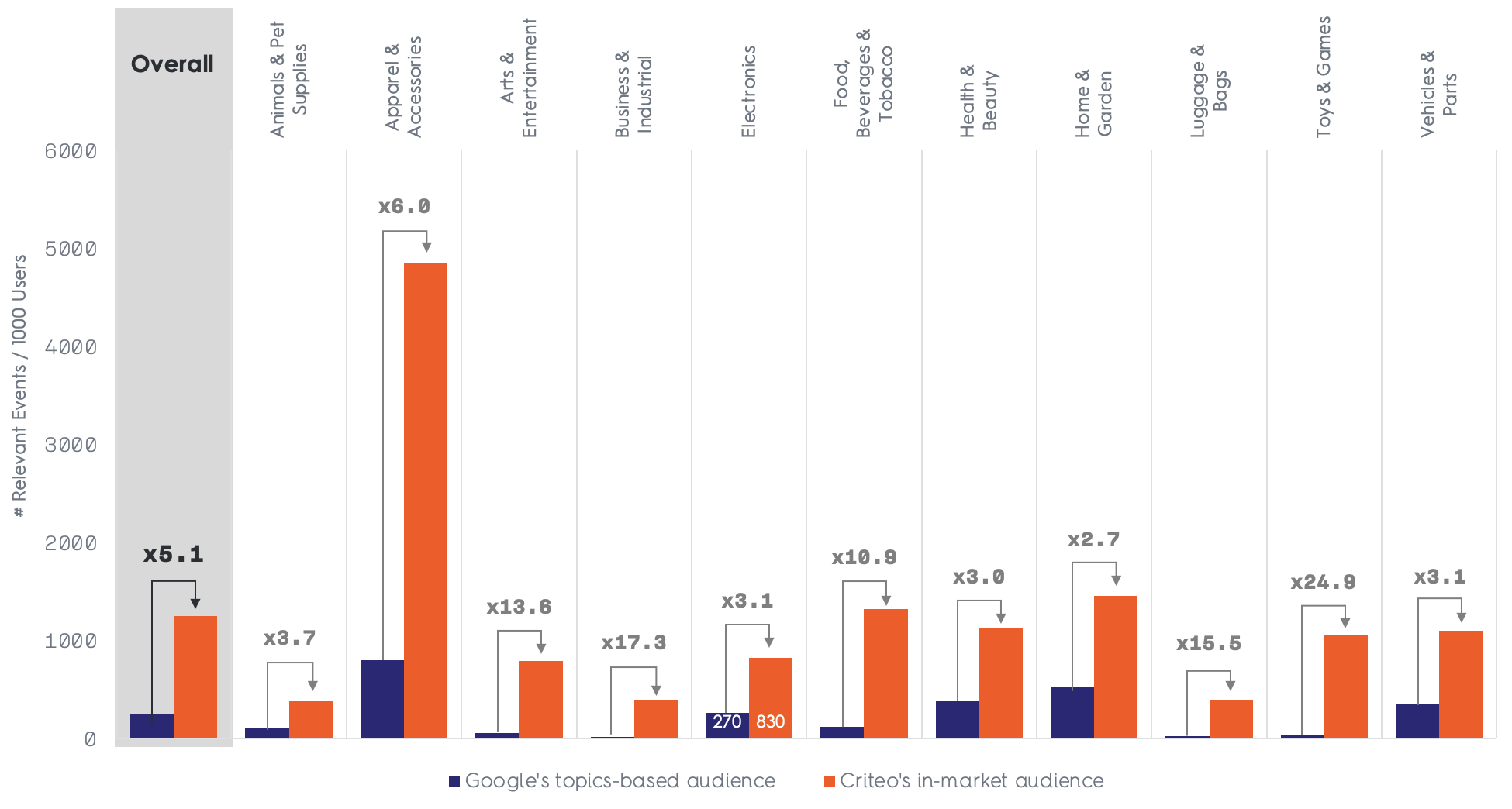 Observamos que la solución actual de Criteo para la publicidad basada en intereses genera audiencias que son de media 5 veces más relevantes que las habilitadas por la versión actual de Topics API. Por ejemplo, en Electrónica, una categoría popular de In-Market: observamos 270 eventos posteriores relevantes por cada 1000 usuarios con la audiencia de temas, mientras que para la de In-Market registraron 830. Esto se traduce en un aumento de la relevancia de x3.