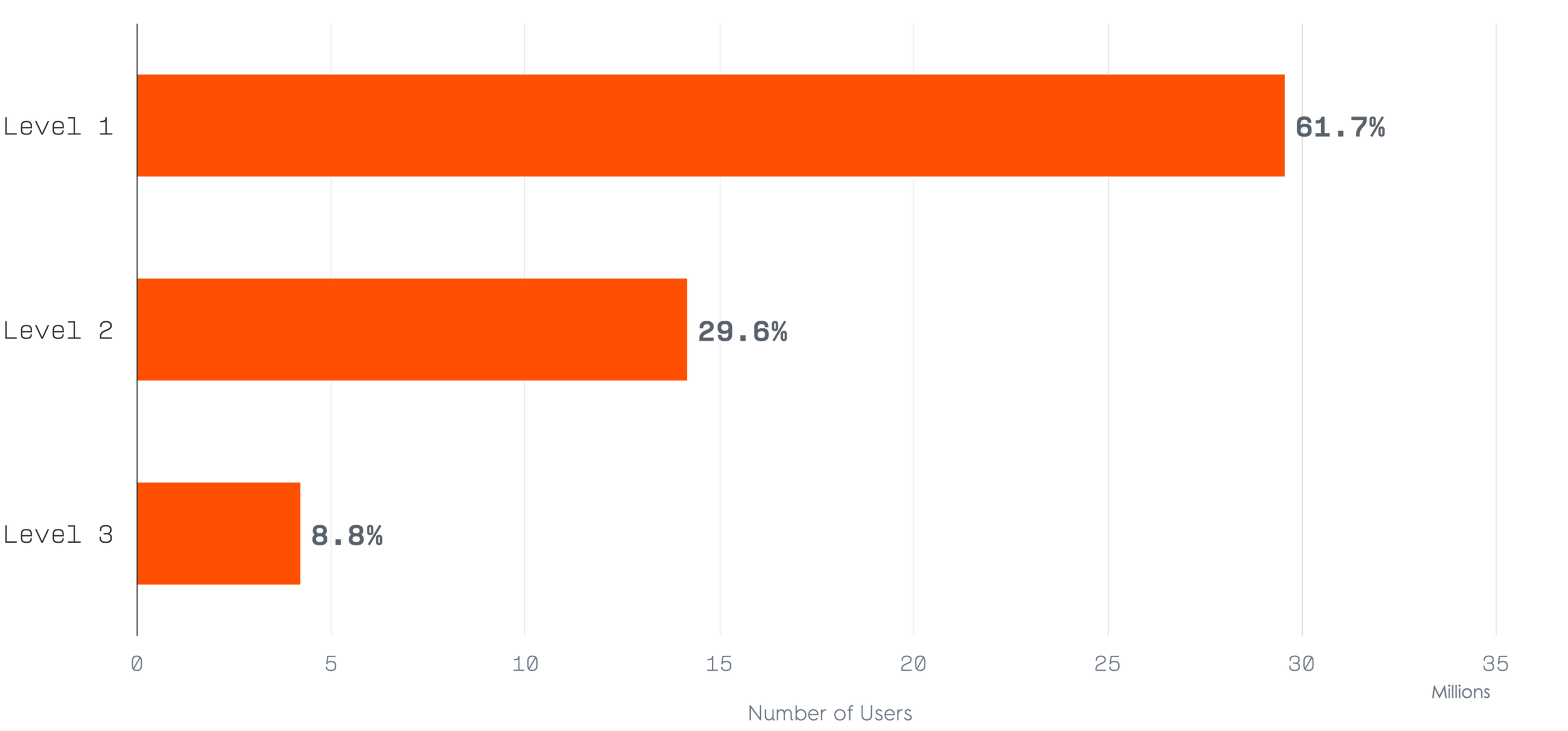 Tras el aumento del volumen de Topics, ya pudieron visualizar los Topics más comunes observados por los anunciantes y publishers con los que están integrados. Su primera observación, ilustrada en la figura 3, muestra que más del 60% de los Topics observados pertenecen al nivel 1, la categoría más general dentro de la taxonomía, que contiene sólo 24 Topics en total.