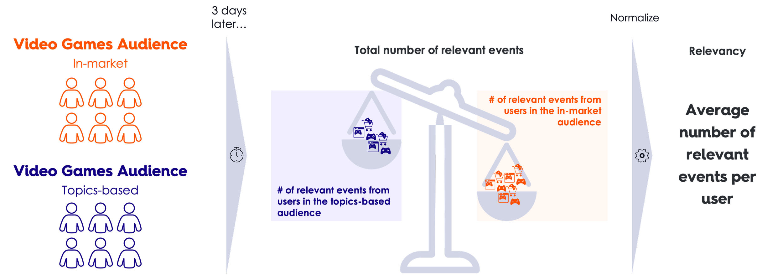Por lo tanto, definieron la relevancia de una audiencia como el número de eventos relevantes observados con posterioridad a la creación de la audiencia. Los eventos relevantes son las visitas orgánicas, las cestas y los eventos de compra asociados a los productos de la categoría seleccionada en la configuración de la audiencia. La figura 7 explica el cálculo de la relevancia para una audiencia de "Videojuegos".