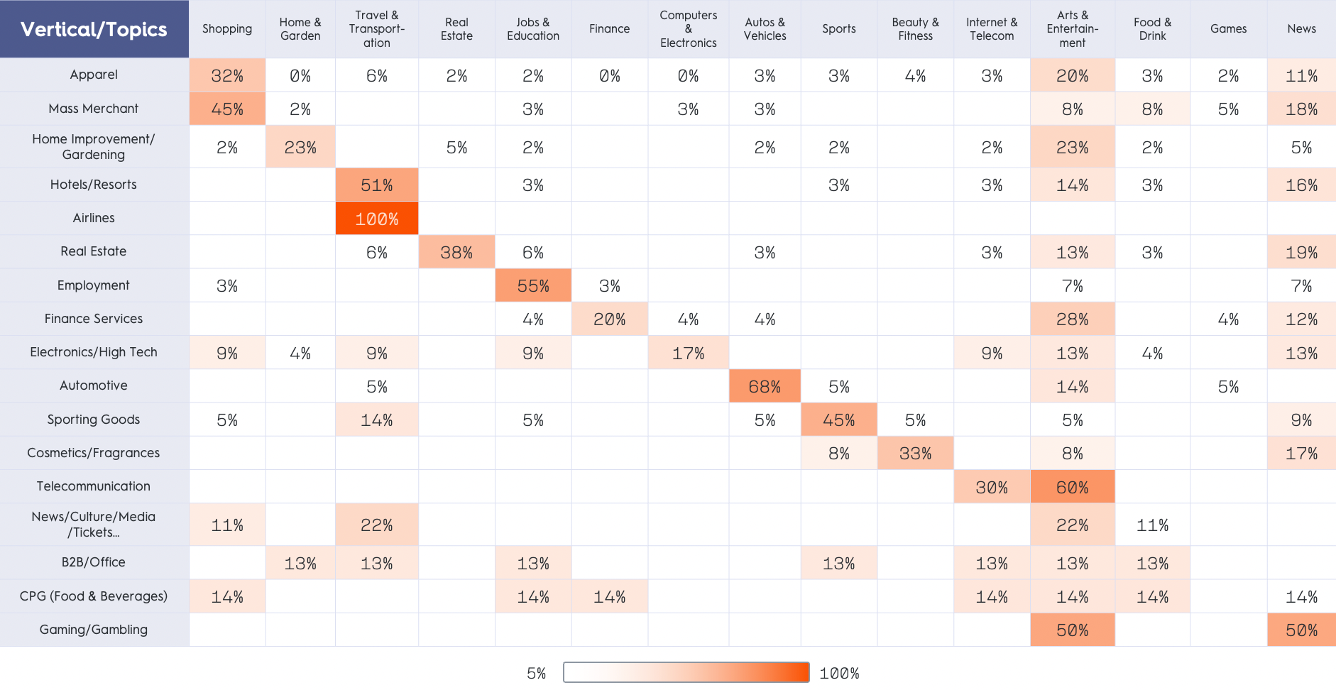 Para evaluar la calidad del clasificador de Topics, lo comparamos con la vertical de anunciantes de Criteo, una categoría asignada para cada anunciante. Para no tener en cuenta la limitación generada por la taxonomía de pruebas, sólo consideramos los verticales de anunciantes que tienen uno o más temas equivalentes (o similares) de nivel 1. La figura 5 muestra un mapa de calor que contiene la clasificación de temas correspondiente a cada vertical para los 1000 principales anunciantes de Criteo.