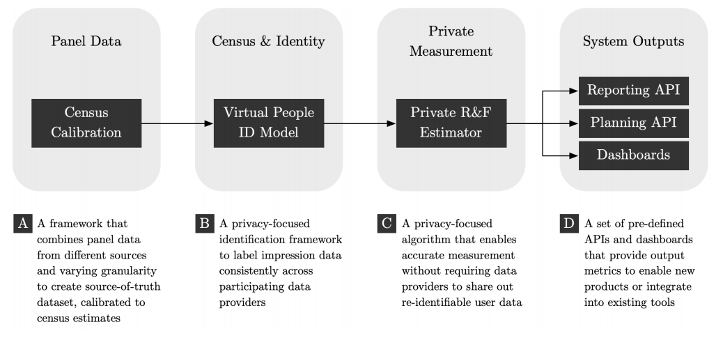 Es decir, la propuesta combina un “panel” de usuarios con datos del censo proporcionados por los medios participantes, así como un procesador de datos de terceros neutral. Asimismo, también se habla sobre varios "virtual IDs" y sobre procesos de modelado avanzados (que están vagamente definidos), con el objetivo de proporcionar una forma para que las plataformas que no comparten un ID común (¿te acuerdas del Universal ID? puedan construir una versión de uno.