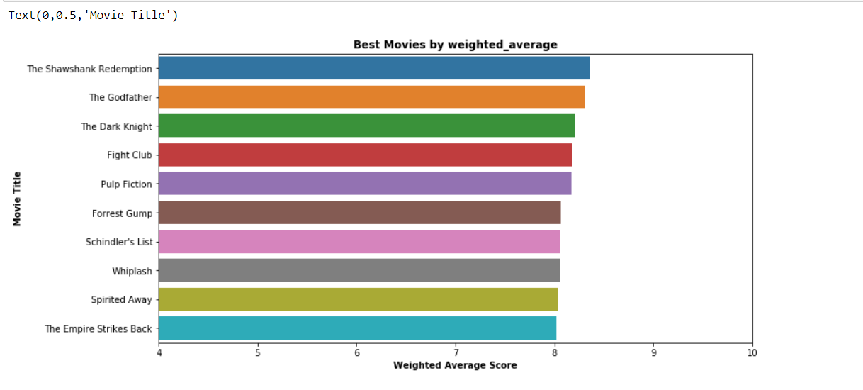 (8) Por último y como resultado, tenemos que The Shawshank Redemption tiene el weighted_average más alto y sucesivamente veremos los títulos de las películas que le seguirían -nuestros productos en este ejercicio-. Al usar una visualización obtendremos esa información de forma más gráfica.